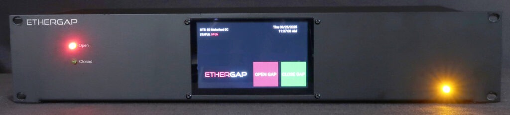Gigabit Ethernet port for the administrative network. Never connected to any outside WAN nor the protected segments, this fully isolated interface allows for triggering the EtherGap to open or close via timer setting (cron, etc.), API, web or mobile app interface, front panel touch screen, and numerous other means. Flexibility allows you maximum convenience making use of an air gap easy and convenient. Out of band signaling on a separate physical layer means it is impossible for anyone to open or close the air gap to access your data so long as the administrative network is kept physically isolated.